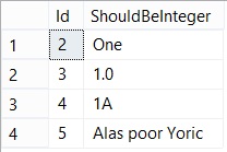 SELECT Id, ShouldBeInteger FROM dbo.UncleanData WHERE TRY_CONVERT(INT, ShouldBeInteger) IS NULL;