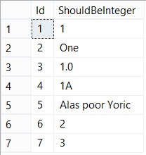 This isn’t just useful where we want to convert values that are valid and ignore the others, we can also use this to identify problem rows\values before we run an update. Let’s say we have the following table dbo.UncleanData that has some troublesome data:
