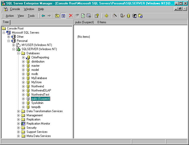 Here the pubs database has been marked suspect and the reason is