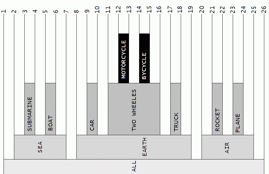 ALL |--SEA | |--SUBMARINE | |--BOAT |--EARTH | |--CAR | |--TWO WHEELES | | |--MOTORCYCLE | | |--BYCYCLE | |--TRUCK |--AIR |--ROCKET |--PLANE