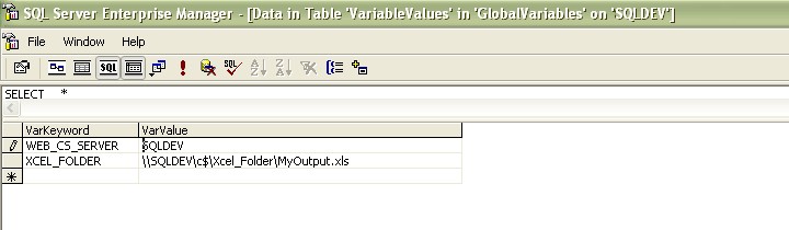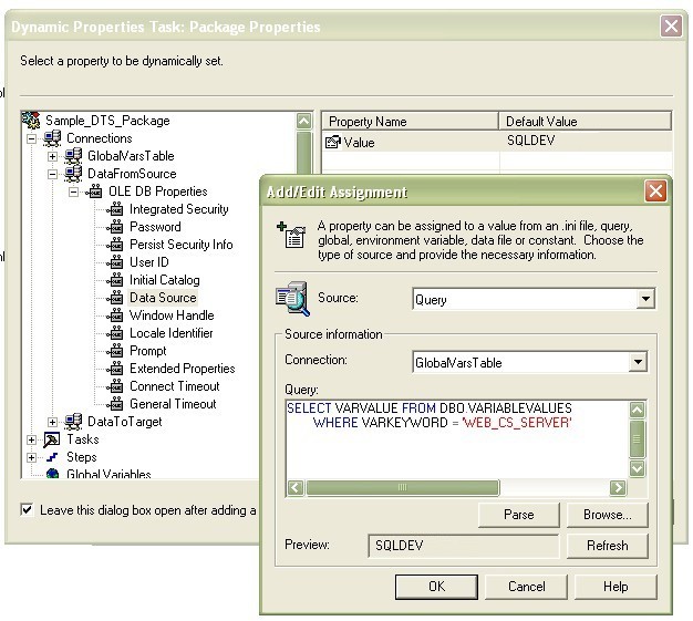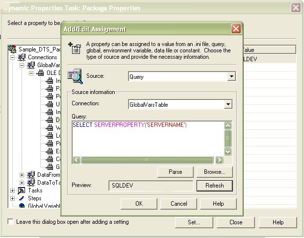 This method requires a SQL Table that becomes a repository of connection variables. It can be as simple as a 2 column table, a common keyword and the actual substitution value. The table has to be in each Server Instance where the actual values can vary or be changed without editing the DTS Package; which is the strength of this method. Fig1 shows a snapshot of the table in the DEV instance.