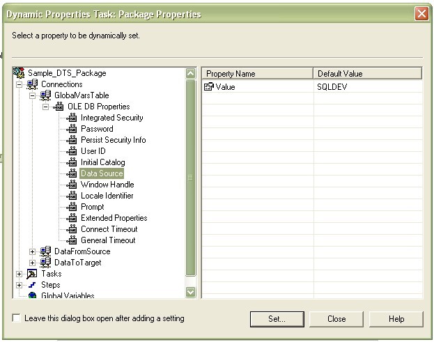 To achieve portability, I will need to define the connection properties to Source and Target by looking them up from the GlobalVars Table. The challenge is that the connection to the Lookup Table needs to be predefined and this is overcome through another Dynamic Properties (Link2GlobalVars) task as shown in Fig3 .