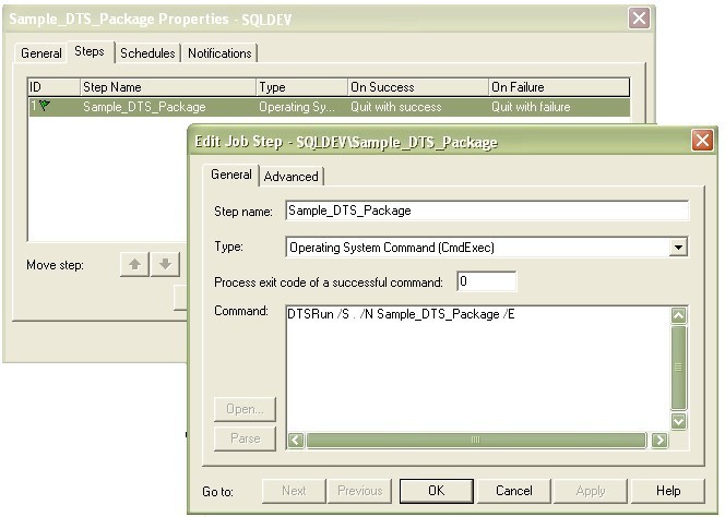 The dot notation on the DTSRUN command designates that it is to run on the local server. The SQL Job can be scripted and installed in any Target Server with little or no modifications.