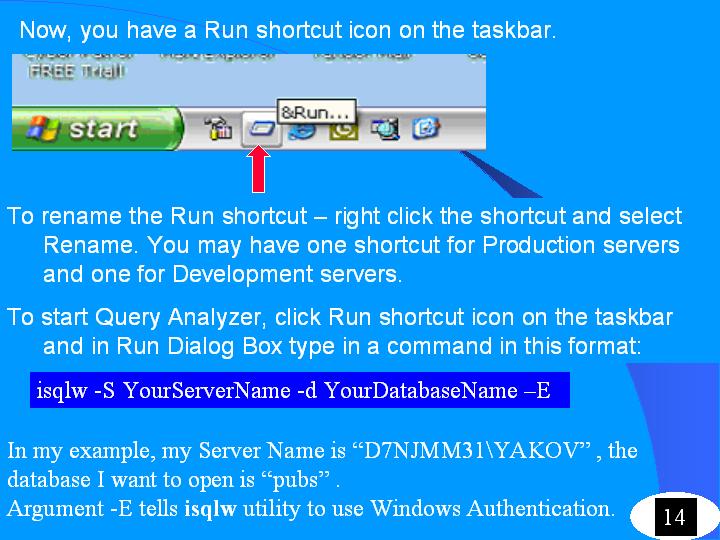 The third method "Preferred" to start the SQL Query Analyzer allows you to open the SQL Query Analyzer using 2-3 clicks! To make this method working all you need to have is a SQL Query Analyzer icon on the Task Bar. Here are the steps detailing how to place a SQL Query Analyzer icon on the Taskbar: