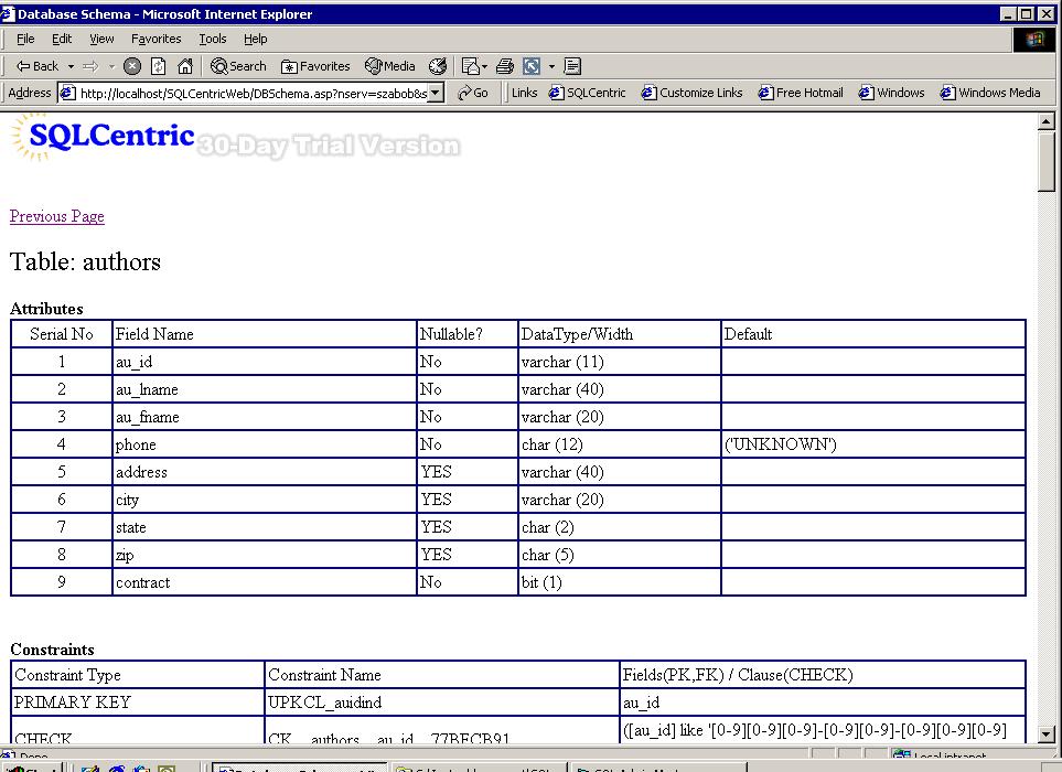 Some of the neat features were that if I clicked on the server name I was brought to an overview screen where I could see the version of SQL and I could also check the logs for the SQL server. If you click on the DBStatus light all the databases on the server are listed. Clicking on the database name displays the schema as shown in the following screen shot.