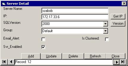The Get Servers option is used to bulk load the servers that can be monitored. This button uses the fact that SQL server broadcasts its existence on the network. I used the Servers button to add the detail for each server I wanted to monitor. The Server Detail screen allows one to control the server individually. Once there are servers to be monitored the servers button brings up the server list.