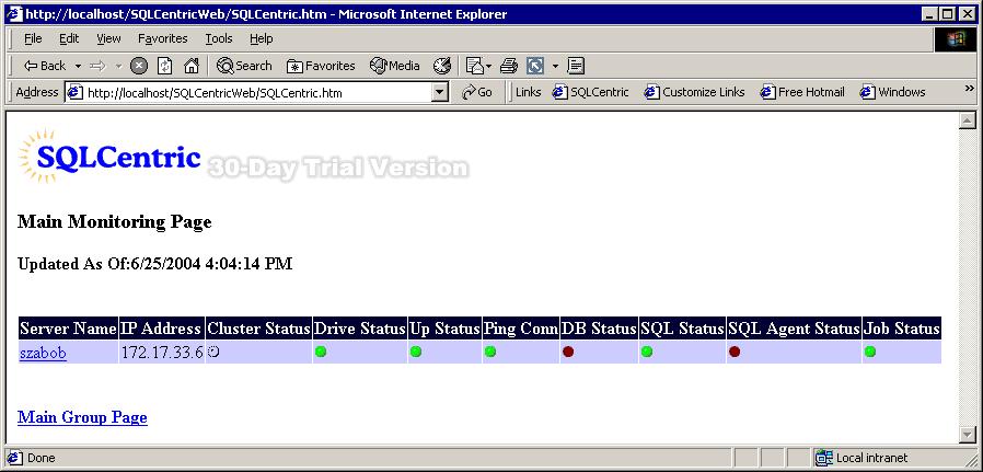 This page is one of two overview screens that can be used to monitor the status of the servers. The other page would be a group's overview that allows one to see an overview of the server groups created by the user. The group's overview bubbles up any error conditions so if one server in the group has a red status in a category the whole group will have a red status light. Each of the items on the web page allows the user to drill further down. For example, clicking on the red SQL Agent Status light for szabob will show you that the SQL Agent service is not running. If a job fails the Job Status light will appear red. This red light only appears for jobs that are enabled.