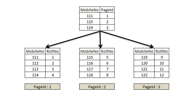 The MobileNo column is unique and query engine can seek through the non-clustered index by navigating from root to locate the leaf level page where MobileNo value is stored for '111', as shown by arrows in Figure 3.