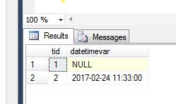 declare @tbldate table (tid int primary key, datetimevar smalldatetime); insert into @tbldate (tid,datetimevar) values (1,'10:00'), (2,'1/1/2017'); select tid, datetimevar from @tbldate;
