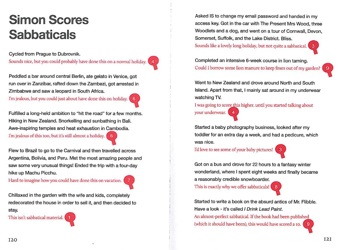 It didn't turn out so well, but perhaps because I hadn't defined very well what a sabbatical is. It's not a vacation, and not a 6 week break from work involving the XBOX. Our CEO scored a number of sabbaticals (see the image below from the Book of Red Gate) in terms of what they accomplished. As you can see from the scores, the idea of the sabbatical is that is provides you a break from work, but that break should be spent somehow trying to improve or grow yourself.