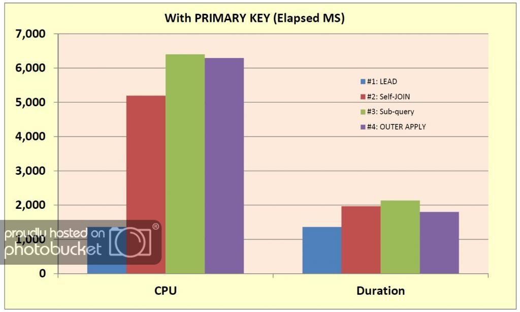 If you do need a solution that will work prior to SQL 2012, the self-JOIN approach is probably better than the other test scenarios, based on elapsed times and CPU. The possible exception to that is the case of the non-CLUSTERED INDEX, where OUTER APPLY may be a better choice.