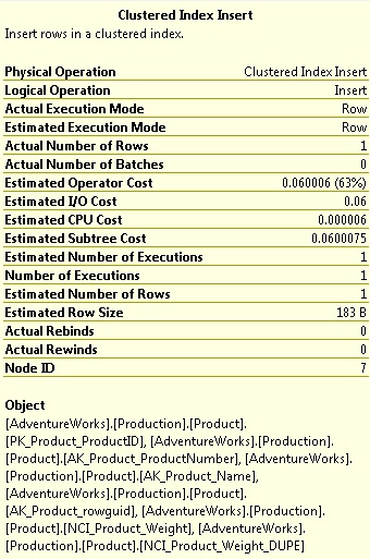 The total subtree cost for this operation is 0.085147 and there were a total of 11 reads on the table itself. Note that the insert itself comprised 59% of the total subtree cost for the entire operation.