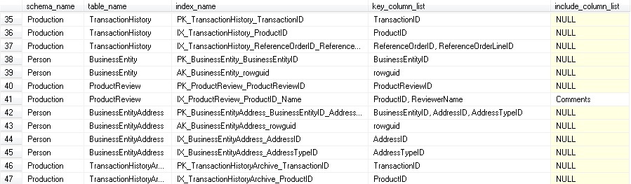 AND INDEX_DATA.type_desc IN ('NONCLUSTERED', 'CLUSTERED')The output of our query looks like this: