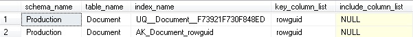 NCI_Product_Weight_DUPE, the index we created earlier, is here as expected. We’ve also caught another dupe on the Production.Document table. Now that we have located 2 sets of duplicates, we are free to drop one copy of each to remove the duplicated functionality. We will not drop these indexes yet, as they will be needed for further testing below.