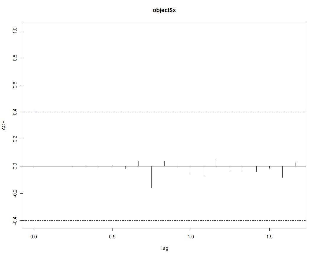 Normally, a time series model could be improved upon by including correlation within prediction errors if there is evidence that there is any. If there is evidence, then more advanced techniques like ARIMA modeling processes that is also available in R could be used to improve the model. To check the model above, we can create a correlogram of the residuals using the sample autocorrelation function acf() as below.