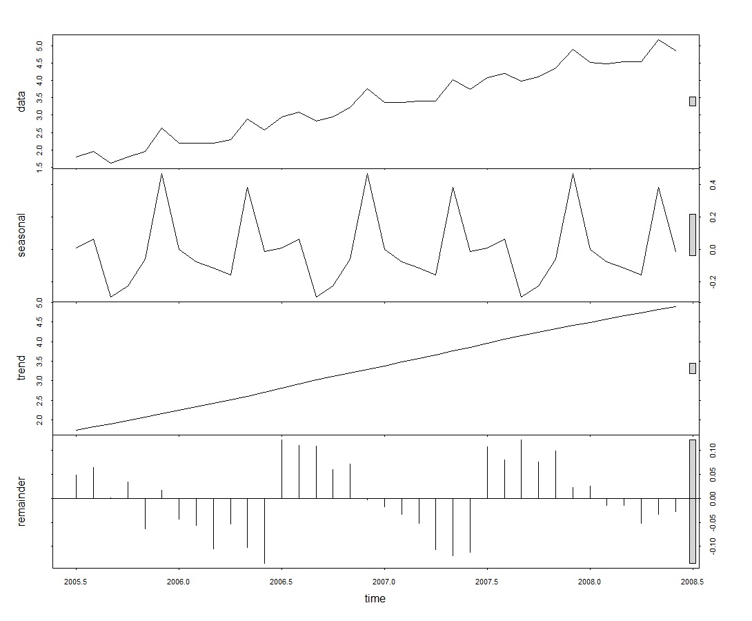 The various component patterns which includes the trend, seasonal and irregular components of the log-transformed time series can further be decomposed using the stl() function and plotted as shown below.