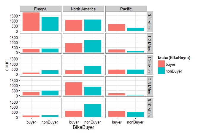 From figure 2 above, it can be seen that in Europe and the Pacific customers who commute between 0-1 miles are more likely to buy bikes whiles in the US those who commute between 2-5 miles are more likely to buy bikes.