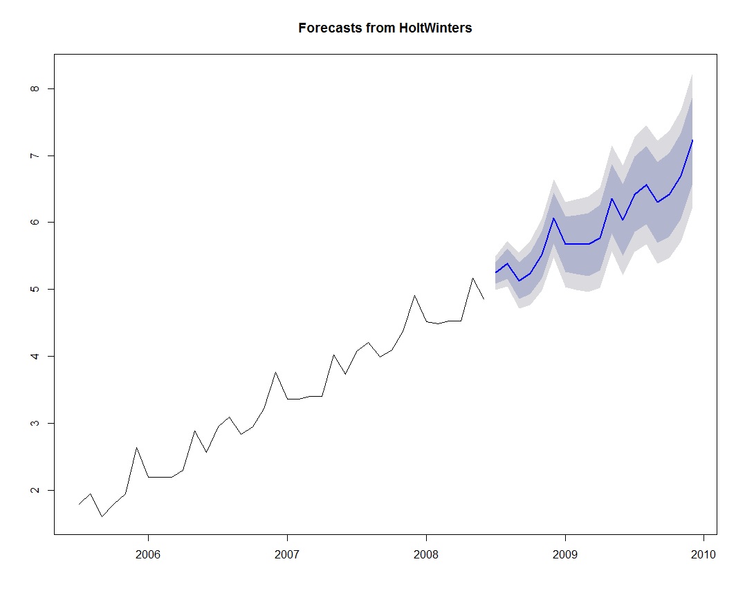To forecasts near future sales not included in the original time series we can use a package called forecast. For example, If we wanted to forecasts 12 months sales after the end of the time series, we load the forecast package and implement the forecasting on span>Holt-Winters fitted model as shown below.