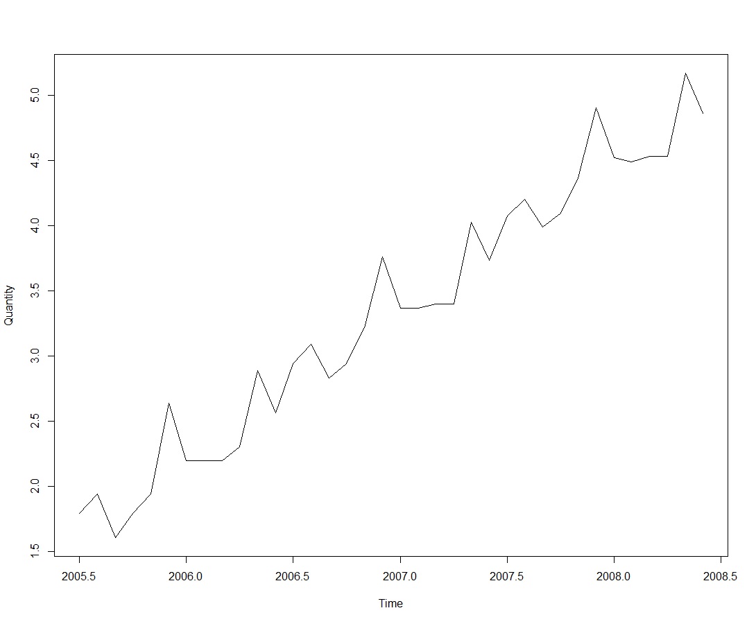 As a simple exercise lets analyze sales of their best-selling M200 Model. A further examination of the M200 Model on figure above shows non-stationarity time series with an upward trend, a seasonal variation, and an increase of the seasonal oscillations over time in size. That means the series is not stationary. Let's try a natural log transformation of the original data after converting M200 Model data to a time series as below.