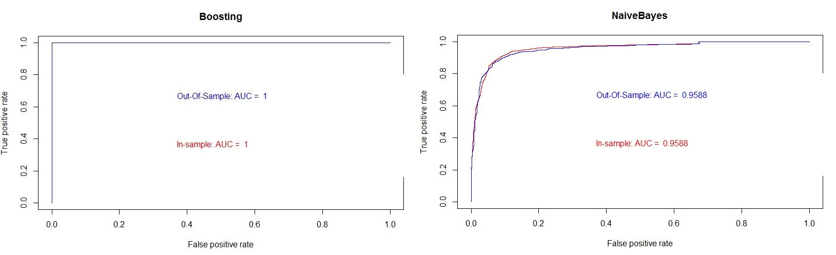 Figure 9: ROC plots showing in-sample and out-of-sample AUC values for Boosting and NaiveBayes.