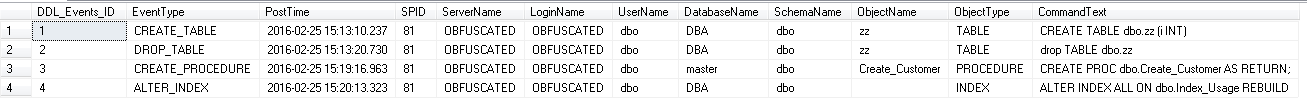 GOQuerying the dbo.DDL_Events table, then gives you an audit trail of DDL changes like so: