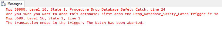 RAISERROR('Are you sure you want to drop this database? First drop the Drop_Database_Safety_Catch trigger if so',16,1);