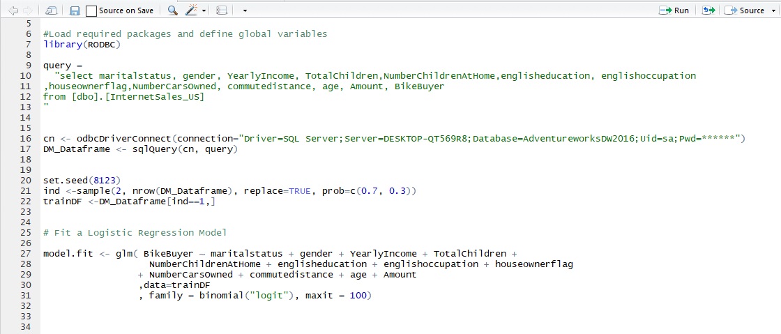 Unlike the previous scenarios where we split the dataset into Training and Test set with R, here we split the data on SQL server using the T-SQL tablesample function as shown in the query variable.