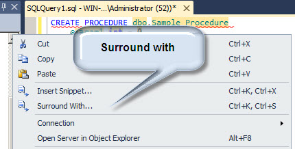 Another new option is the Surround with. To activate this option, right click in the SQL Server Management Studio Script pane and select Surround with or press Ctrl+k,Ctrl+s