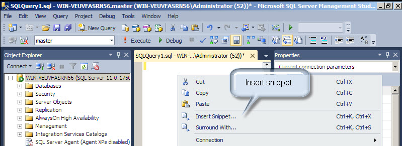 The SQL Server 2012 Management Studio now tries to look like the Visual Studio. It is including more and more features similar to attract VS developers. In this article we are going to look two new enhancements: the Insert snippet menu option and the surround with option.