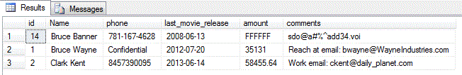 ( 'Bruce Banner', '781-167-4628', '20080613', 'FFFFFF' , 'sdo@a#%^add34.voi');Starting by ‘some string’