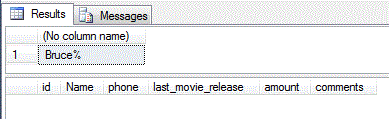 DECLARE @Name char(50) = 'Bruce'; SET @Name = RTRIM( @Name) + '%'; SELECT @Name; SELECT * FROM dbo.LIKETest WHERE Name LIKE @Name;