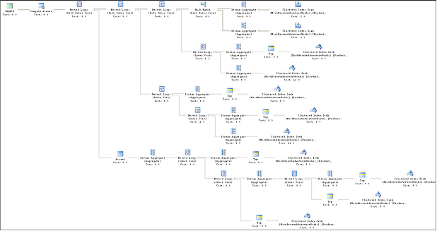 several Clustered Index Scan and Seek operations. The query plan is displayed