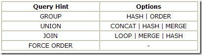 Join hints { LOOP | HASH | MERGE | REMOTE } and the query hints shown below are all implemented by disabling one or more optimizer rules:
