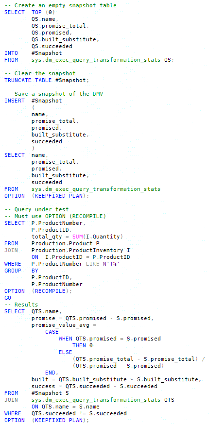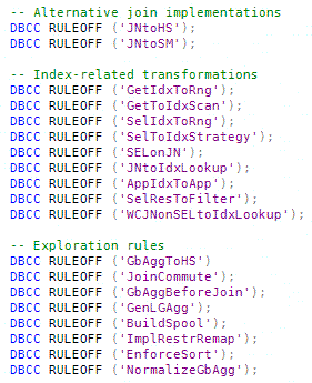 Join hints and query hints don't expose options to selectively enable or disable the full range of rules available to the optimizer. We can, however, use a couple of undocumented DBCC commands and the undocumented dynamic management view sys.dm_exec_query_transformation_stats (covered back in Part 3) to explore the way the optimizer uses rules.
