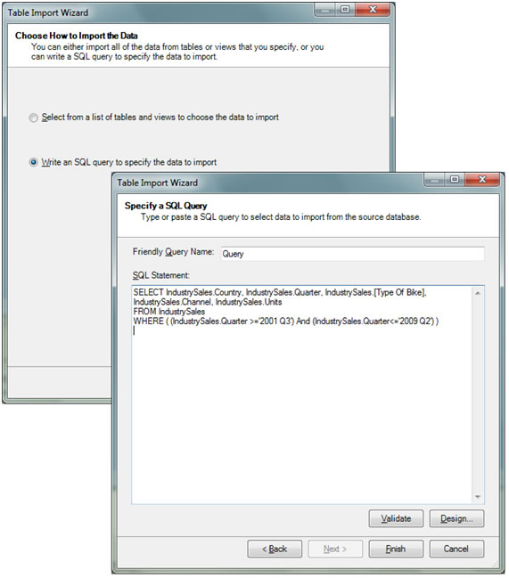 In the next window (Figure 5), select the option that will let you write a custom SQL statement. Input the following query, and click on the finish button to import the data, and the results window should look like Figure 6.