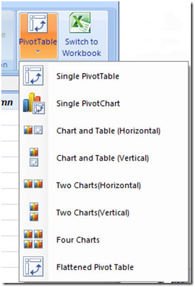 You may have noticed in Figure 7 that we actually have some more buttons enabled now that we’ve got some data: ‘Refresh’, ‘Manual’ and ‘PivotTable’. The ‘Refresh’ button re-imports the data from the sources, just like any other refresh button. You should use the ‘Manual’ button when you have calculated columns and don’t want automatic calculation to occur, because it can cause performance problems (Once you’ve activated the Manual mode, you can deactivate it by simple clicking on it). The ‘Calculate’ button is only available when you are in Manual mode; once clicked, the selected columns will be calculated in the PowerPivot window. The PivotTable button is the one that you need to look at more closely at the moment; clicking on it will show you an extended menu: