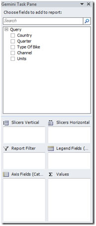 Does the Gemini Task Pane look familiar to you? It’s actually very similar to the Excel Dynamic Table Pane, but with new addition of ‘slicers’ (we will see what they do in a moment).