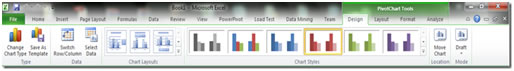 Now we’ll select some data to populate the charts. Using the Task Pane, you can use the checkboxes by the data fields, or you can drag and drop the fields into the desired place at the bottom of the Pane: Legend fields, Axis fields, Values or filters (as you can see in Figure 11). You can also use the new ‘Slicers’, which are essentially like filters which can be connected to multiple pivot tables, and which you can turn on or off with just a click! Don’t forget that PowerPivot for Excel is designed to be used by the ‘decisions makers’, for whom Excel is a native environment, so this slick and easy behavior is very handy.