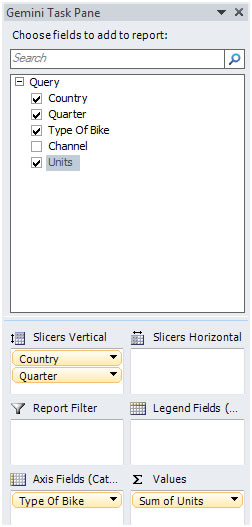 Click on the first chart (the top-left one), drag-&–drop the Country and Quarter columns from the Gemini Task Pane to the Slicers Vertical region. Then click on the Type of Bike and Units checkboxes, and your Gemini Task Pane will look like Figure 12. For the other charts you now just need to mark the desired check boxes…