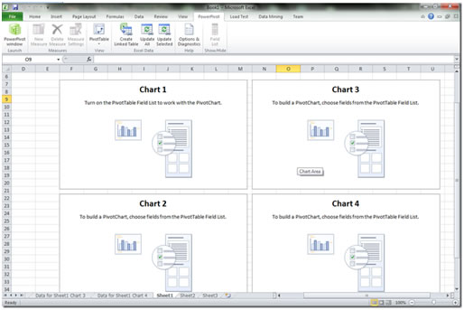 When you select one of these items, Excel will ask you where you want PowerPivot to create the template (in a new worksheet or an existing worksheet); whichever you choose, PowerPivot will create the template, and Excel will look like Figure 9 (for my example I’ve selected the Four Charts option).