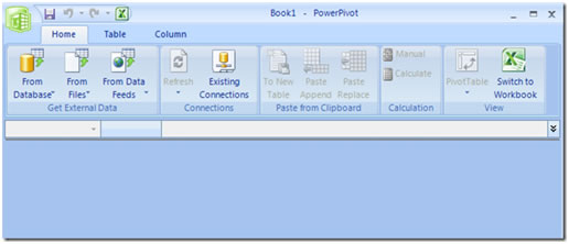 Of course, assuming it’s the first time that you’ve used the feature, the PowerPivot window will be empty because you don’t any have data yet. What we have enabled are the buttons to get data, to list and configure the existing connections, and to switch back to the workbook (the last of which can also be achieved by clicking on the excel icon over the Table tab).