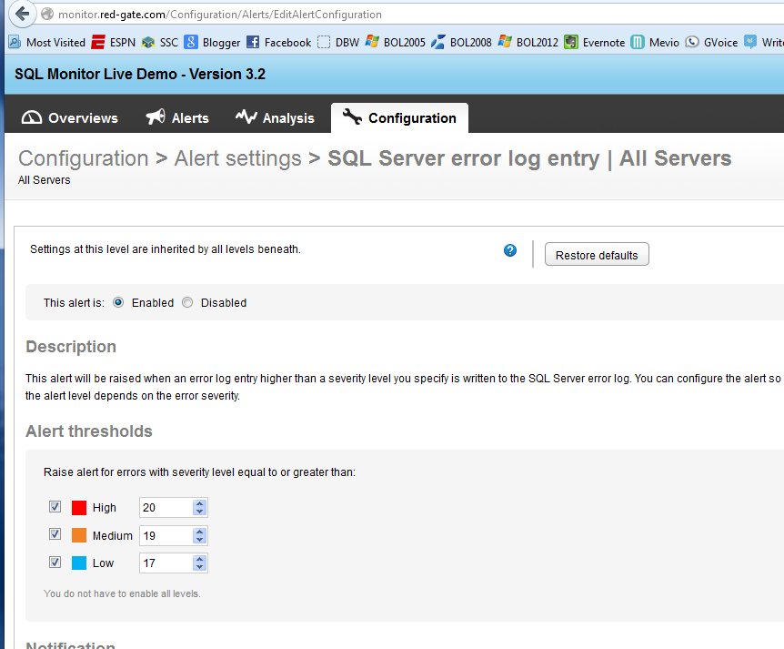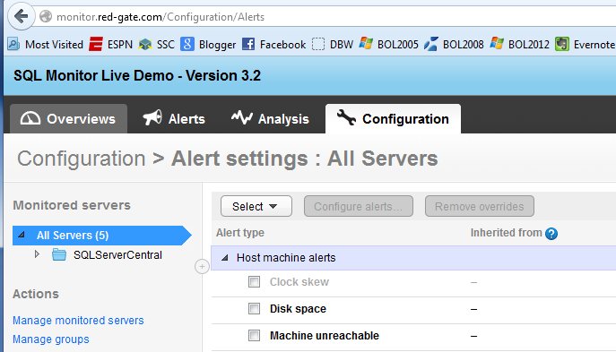 However there's no need to do this. In SQLMonitor, we have a built in alert that scans for error log entries. If I go to monitor.red-gate.com and look at the Configuration tab, I'll have all the built in alerts. These are broken down by host and SQL Server specific alerts: