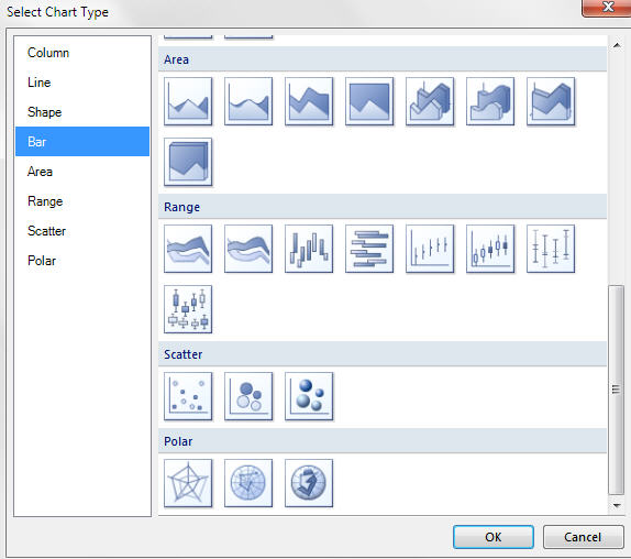 You can see from the dialog box below the range of chart types supported: