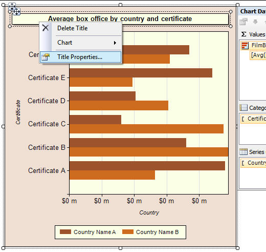 To understand how good charts are in SSRS 2008 R2, you have to know how bad they were in SSRS 2005 (when it was impossible to right-click on any individual part of a chart to format it). Charts now work pretty much the way you'd want them to - for example, in the diagram below you can right-click on a chart title to format it (Excel users might be wondering at this point what all the fuss is about!):