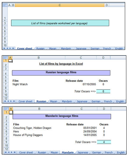 So in the example above, we've created an Excel workbook containing one weeksheet for each language, such that each such worksheet contains all of that language's films. The details of how to do this are beyond the scope of this article, but are explained in this blog on using RenderFormat and PageName to create Excel workbooks.