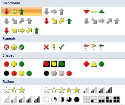 if you're thinking this all looks like conditional formatting in Excel, you'd be right, but actually SSRS does it much better: for example, for any of the icons above you can change the background colour (so if you don't want red, amber and green arrows, for example, you could have pink, purple and mauve ones instead).