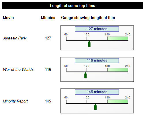 Indicators are actually a specific instance of the more flexible gauges (both were incorporated within SSRS from what was previously an add-in from Dundas, a third-party supplier). You can have either linear or radial gauges - examples of both are shown below. First, an example of a linear gauge to show visually the length of a film (or movie, for those reading this in the States):