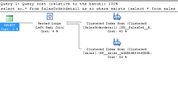 If you see the execution plan below after you've run the above select statement, you will see that the optimizer doesn't even look at the sales table. Only salesorderdetail table is accessed. This is because the optimizer knows that it is no point executing the EXISTS operator as the foreign key constrain requires all sales to refer to an existing customer which is what the WHERE clause is doing.