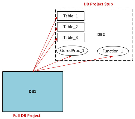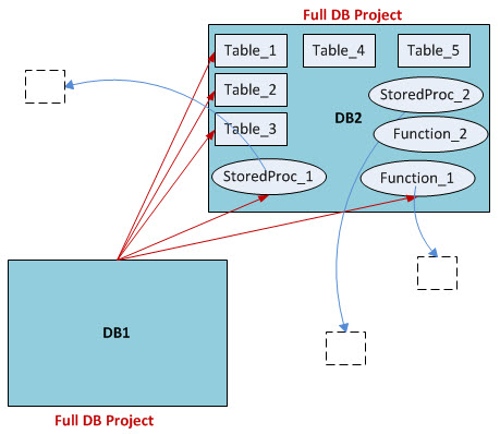 There are references from DB1 to DB2 (red), and references from DB2 to other databases (blue). The condition that all references had to exist had so far pushed a SSDT project out of reach. However, I had an epiphany one day. What if I created a project only to deploy DB1? And what if I gave it only those objects from DB2 that it needed to resolve references, and nothing more? From the above image, DB1 only needs Table1, Table2, Table3, StoredProc1 and Function1 from DB2. It has no need for Table4, Table5, StoredProc2 and Function2. This would greatly reduce the number of objects and references in the project. I reasoned that the number of references would still be large enough to cause performance issues in the DB1 project, so I created a separate solution and project for DB2. This project would only have DB2 objects in it, and only those objects needed by DB1, as follows: