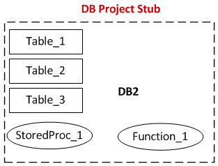 Although the DB2 project was technically sound in that it built and deployed without error, it only had table definitions without any table data. Also, any stored procedures and functions in DB2 were empty shells. There was no need for them to have the real code, just as long as the signature met the requirements that the reference from DB1 was looking for, and it was syntactically valid. So my DB2 objects looked like this: